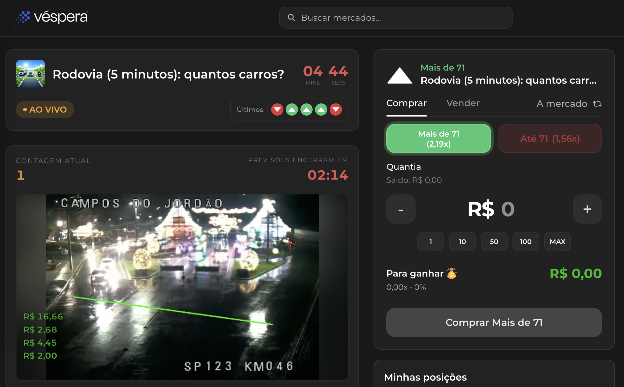 O funcionamento do Véspera Market é baseado em decisões tomadas antes do resultado final. O usuário analisa o contexto e escolhe sua posição com base nas informações disponíveis.